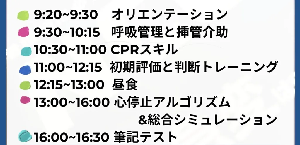 NCLSは臨床での対応を更に高みにするためのコースといった印象です。CPRなどを丁寧に説明する部分は少ないため、BLS(胸骨圧迫やAED)などのスキルを最低限取得してからの受講をオススメします。
